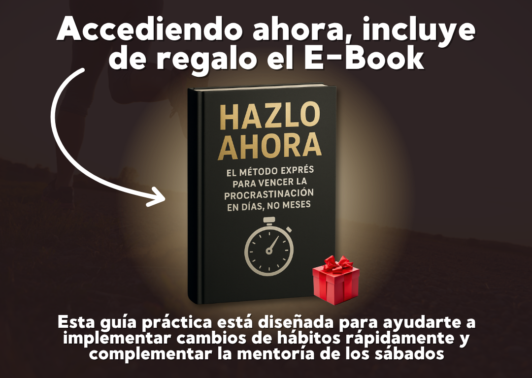 Como bono inmediato, recibirás mi libro digital exclusivo: "HAZLO AHORA - El método exprés para vencer la procrastinación en días". Esta guía práctica está diseñada para ayudarte a implementar cambios de hábitos rápidamente y complementar la mentoría de los sábados. El cual obtendrás al acceder a la Sala mediante un correo electrónico con el link de descarga.